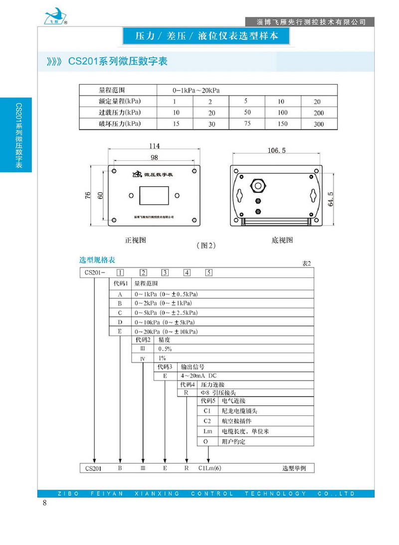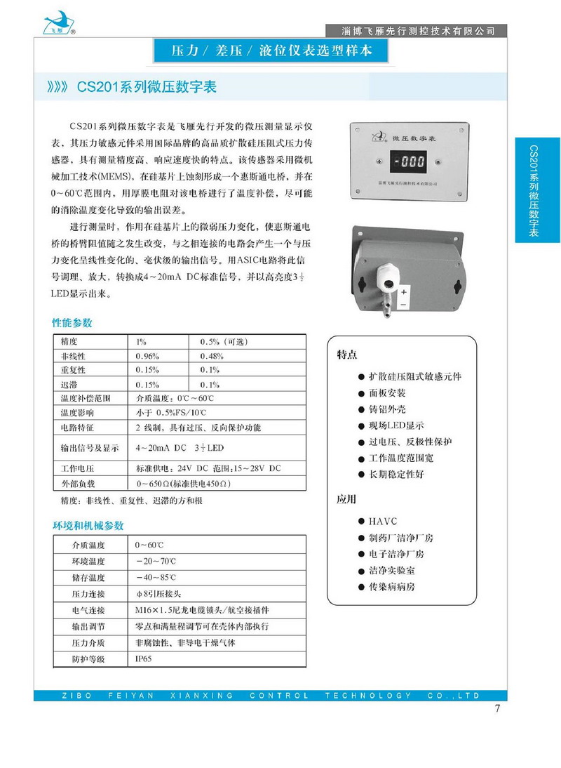 CS201系列微壓數(shù)字表是飛雁先行開發(fā)的微壓測量顯示儀表,其壓力敏感元件采用國際品牌的高品質(zhì)擴散硅壓阻式壓力傳感器,具有測量精度高、響應(yīng)速度快的特點,該傳感器采用微機械加工技術(shù)(MEMS) , 在硅基片上蝕刻形成一個惠斯通電橋, 并在0-60℃范圍內(nèi),用厚膜電阻對該電橋進行了溫度補,盡可能的消除溫度變化導(dǎo)致的輸出誤差。 進行測量時,作用在硅基片上的微弱壓力變化,使惠斯通電橋的橋臂阻值隨之發(fā)生改變,與之相連接的電路會產(chǎn)生一個與壓力變化呈線性變化的, 毫伏級的輸出信號。用ASIC電路將此信號調(diào)理、放大, 轉(zhuǎn)換成4~20mA DC標(biāo)準(zhǔn)信號, 井以高亮度3½LED顯示出來。