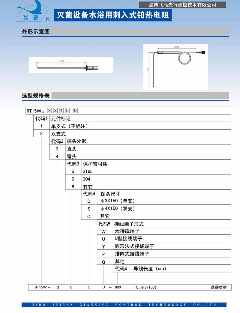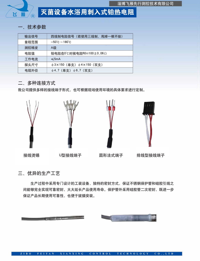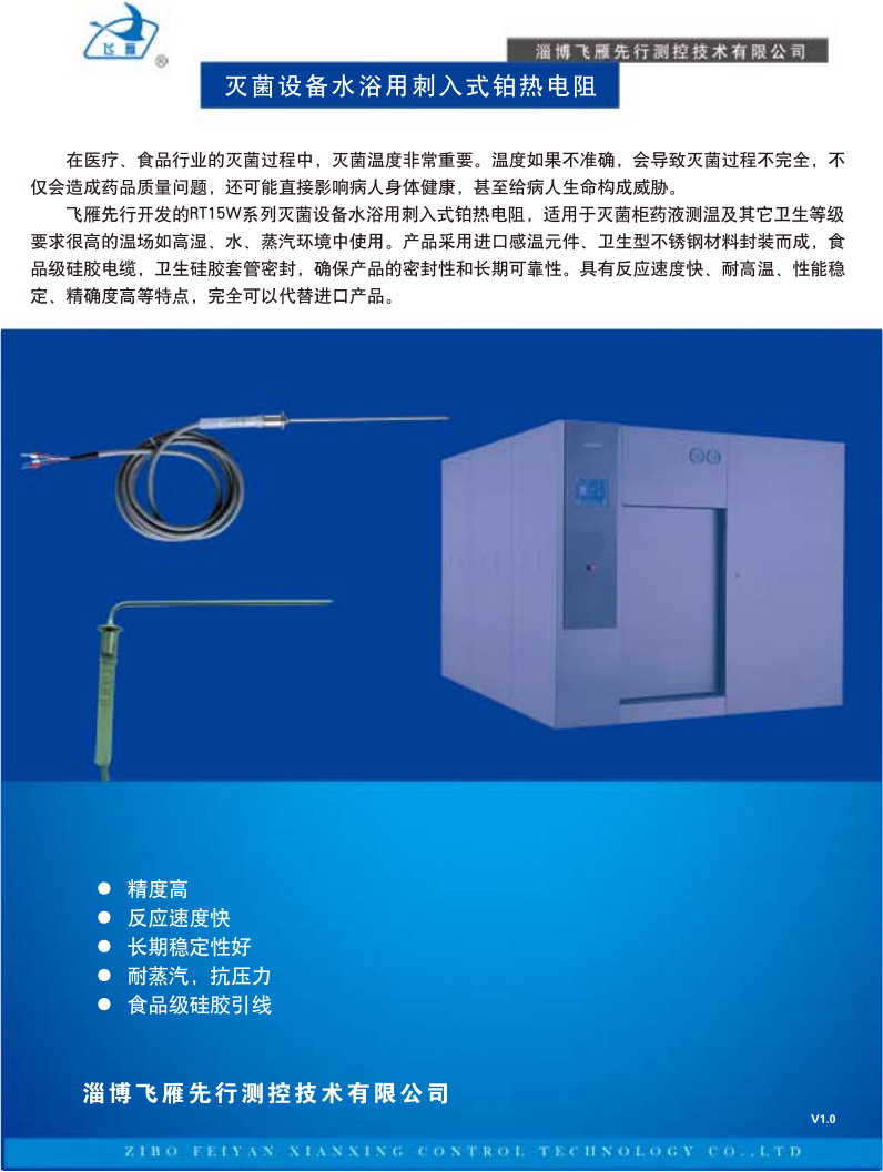 飛雁先行開發(fā)的RT15W系列滅菌設(shè)備水浴用刺入式鉑熱電阻,適用于滅菌柜藥液測溫及其它衛(wèi)生等級要求很高的溫場如高濕、水、蒸汽環(huán)境中使用。產(chǎn)品采用進(jìn)口感溫元件、衛(wèi)生型不銹鋼材料封裝而成,食品級硅膠電纜,衛(wèi)生硅膠套管密封,確保產(chǎn)品的密封性和長期可靠性。具有反應(yīng)速度快、耐高溫、性能穩(wěn)定、精確度高等特點(diǎn),完全可以代替進(jìn)口產(chǎn)品。