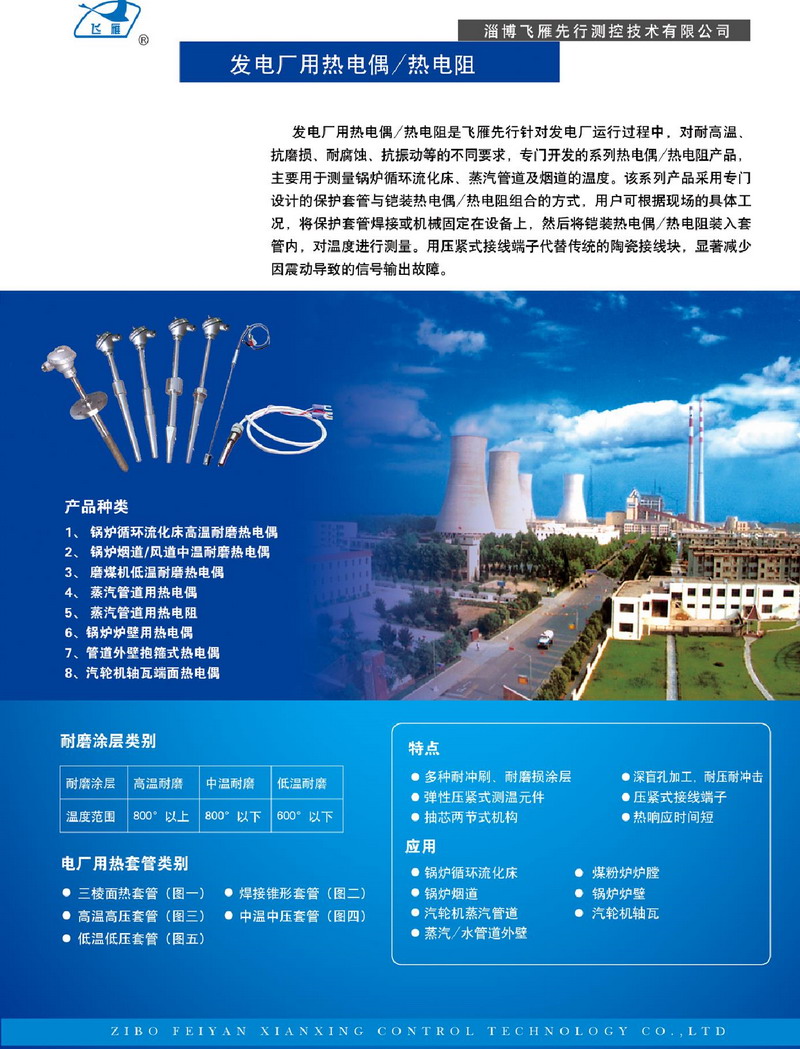 發(fā)電廠用熱電偶/熱電阻是飛雁先行針對(duì)發(fā)電廠運(yùn)行過(guò)程中,對(duì)耐高溫、抗磨損、耐腐蝕、抗振動(dòng)等的不同要求,專門(mén)開(kāi)發(fā)的系列熱電偶/熱電阻產(chǎn)品,主要用于測(cè)量鍋爐循環(huán)流化床、蒸汽管道及煙道的溫度。該系列產(chǎn)品采用專門(mén)設(shè)計(jì)的保護(hù)套管與鎧裝熱電偶/熱電阻組合的方式,用戶可根據(jù)現(xiàn)場(chǎng)的具體工況,將保護(hù)套管焊接或機(jī)械固定在設(shè)備上,然后將鎧裝熱電偶/熱電阻裝入套管內(nèi),對(duì)溫度進(jìn)行測(cè)量。用壓緊式接線端子代替?zhèn)鹘y(tǒng)的陶瓷接線塊,顯著減少因震動(dòng)導(dǎo)致的信號(hào)輸出故障。