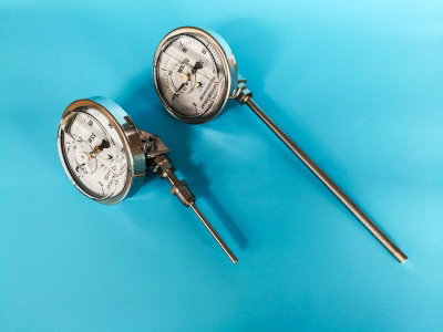 電接點雙金屬溫度計則在結(jié)構(gòu)上增添了電接觸組,調(diào)節(jié)裝置和出線盒等部件。在溫度變化時,當與預先設(shè)定的控溫定觸點(上限或下限)相接觸或斷開的瞬間,使控制線路中的繼電器或接觸器動作,從而實現(xiàn)了自動控溫或報警的功能。
