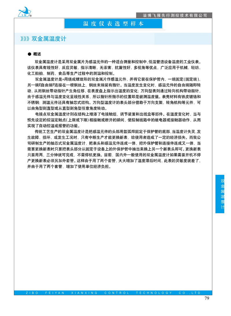 雙金屬溫度計是采用雙金屬片為感溫元件的一種適合測量和控制中,低溫管道設(shè)備溫度的工業(yè)儀表。該儀表具有線性好、反應(yīng)靈敏、指示清晰,無汞害、抗震性好、多視角等優(yōu)點,廣泛應(yīng)用于機械、輕紡、化工船舶.制藥、食品等生產(chǎn)過程中的測溫和控制。