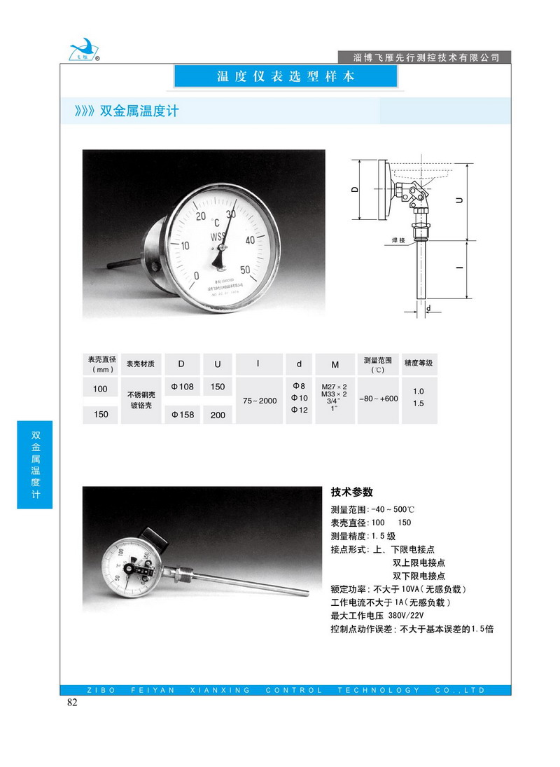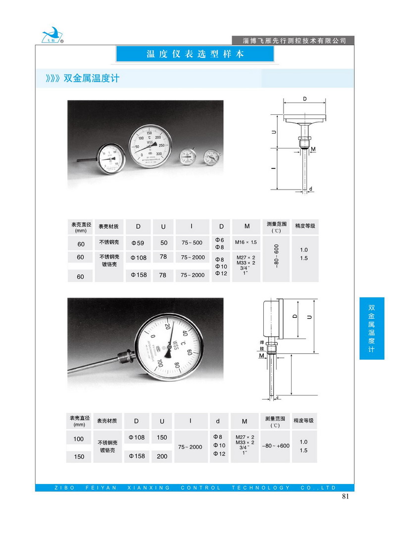 雙金屬溫度計是=用繞成螺旋形的雙金屬片作感溫元件,并將它裝在保護管內(nèi),一端固定(固定端).另一端E自由端F連接在一根鋼絲上,鋼絲末端裝有指針。當溫度發(fā)生變化時,感溫元件的自由端隨即轉(zhuǎn)動.從而鋼絲帶動指針產(chǎn)生角位移.在表度盤上指示出溫度的變化:萬向型表則通過轉(zhuǎn)向機構(gòu)帶動指針,由于感溫元件與溫度變化呈線性關(guān)系,所以指針所指示的位置即是被測溫度值。表殼材料有鐵皮鍍鉻和不銹鋼:測溫元件還具有抽芯式結(jié)構(gòu)。萬向型溫度計的表頭部分借助于萬向支架,轉(zhuǎn)角機構(gòu)等元件,可以由角型到直型或從直型到角型任意角度轉(zhuǎn)動。